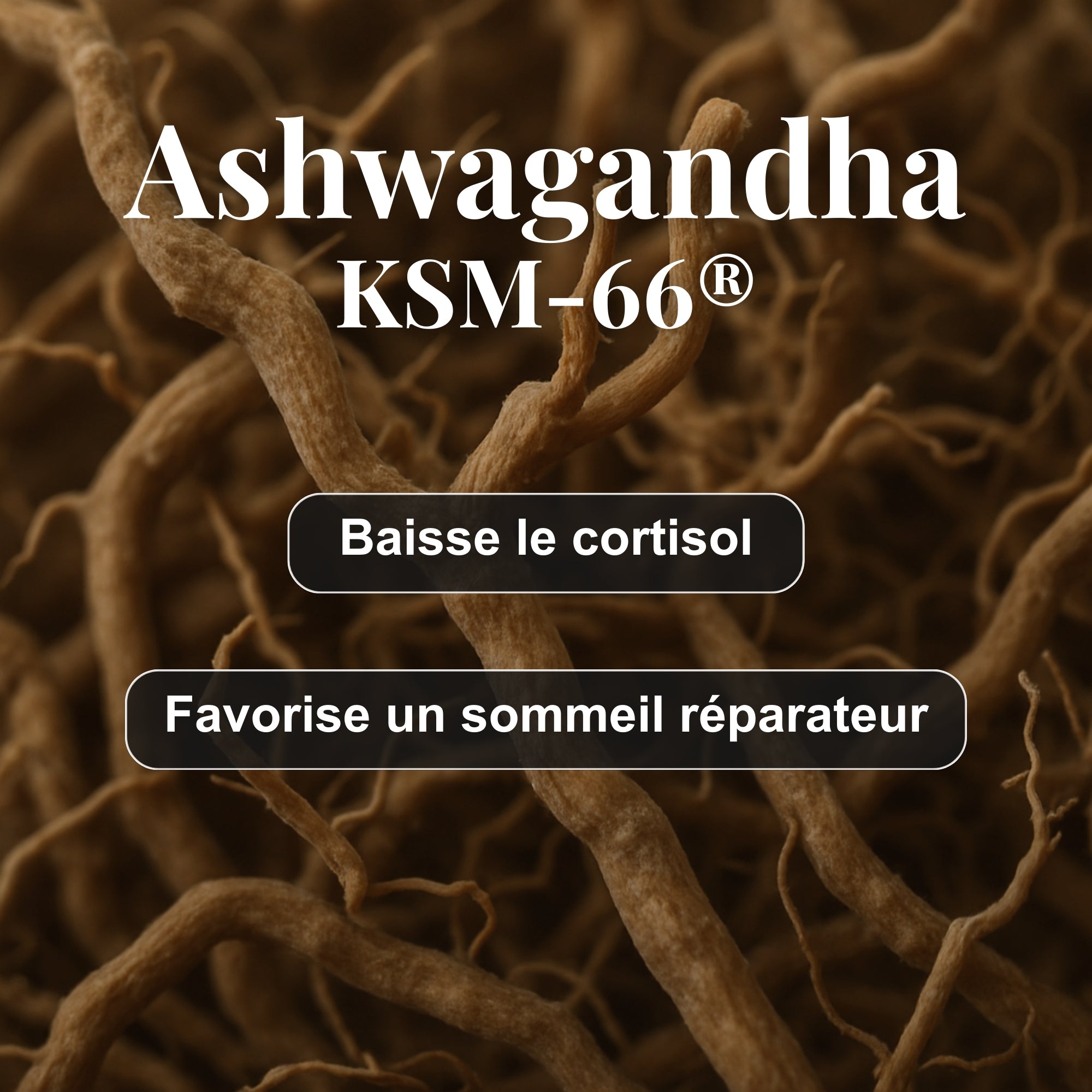 KSM-66®, poudre de cannelle (Cinnamomum verum), poudre de curcuma (Curcuma longa), poudre de cardamome (Elettaria cardamomum), poudre de muscade (Myristica fragrans), poudre de gingembre (Zingiber officinale), poudre de clou de girofle (Syzygium aromaticum), poudre